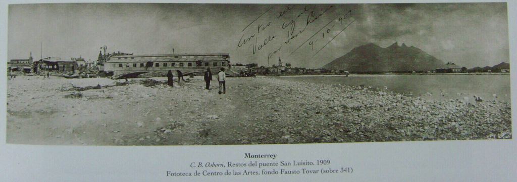 “El 14 de agosto de 1903, a eso de las once de la mañana llegó una tormenta que en momentos e intervalos ha durado toda la noche, en que entra en prensa nuestro periódico La Voz de Nuevo León. […] el lecho del río (Santa Catarina) que estaba seco, quedó en pocas horas lleno en su cauce, al fin salió de madre arrastrando en su ímpetu el puente de madera, que une la población con el barrio de San Luisito, la corriente llevaba diversos objetos sobre los que pudieron verse animales domésticos; varios jacales fueron arrastrados por él.”