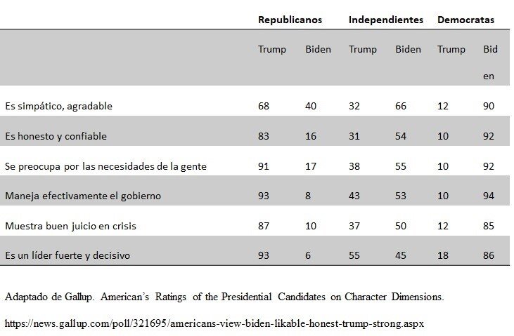 De acuerdo con estadísticas de Gallup (ver aquí) en la semana del 16 al 27 de octubre del presente, el porcentaje de electores republicanos y demócratas se daba en partes iguales, 31% cada uno y 36% se declararon independientes, que son finalmente los que deciden las elecciones. El 93% de los republicanos considera a Trump como un líder fuerte y decisivo quien maneja efectivamente el gobierno. Mientras, 55% de los independientes ve un Trump fuerte. 83% de los republicanos piensa que Trump es honesto y confiable.