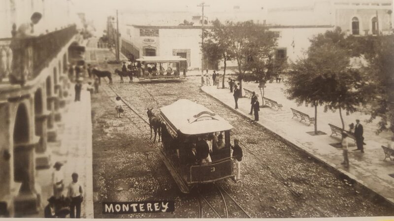 El gobierno del estado autorizó en 1882, la concesión para la instalación y servicio de un tranvía urbano semejante al que operaba en las principales ciudades de los Estados Unidos, cuya fuerza motriz se denominaba “tracción de sangre” debido a que los furgones eran movidos por caballos o mulas. La primera ruta de los llamados “tranvías de mulitas” en Monterrey inició su servicio en enero de 1883, la tarifa por tres kilómetros era de seis centavos y podían transportar sin cargo una arroba, es decir 11.5 kg. La ruta iniciaba en la parte norte de la Plaza de Armas (hoy Plaza Zaragoza) y llegaba hasta la estación del Ferrocarril Nacional, que se ubicaba en la calle Colón y Progreso hoy Pino Suarez.