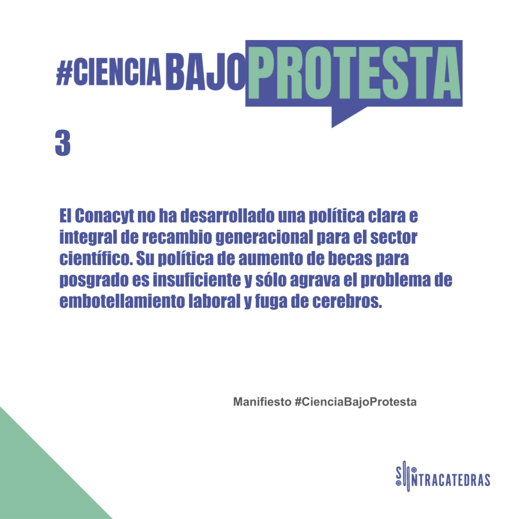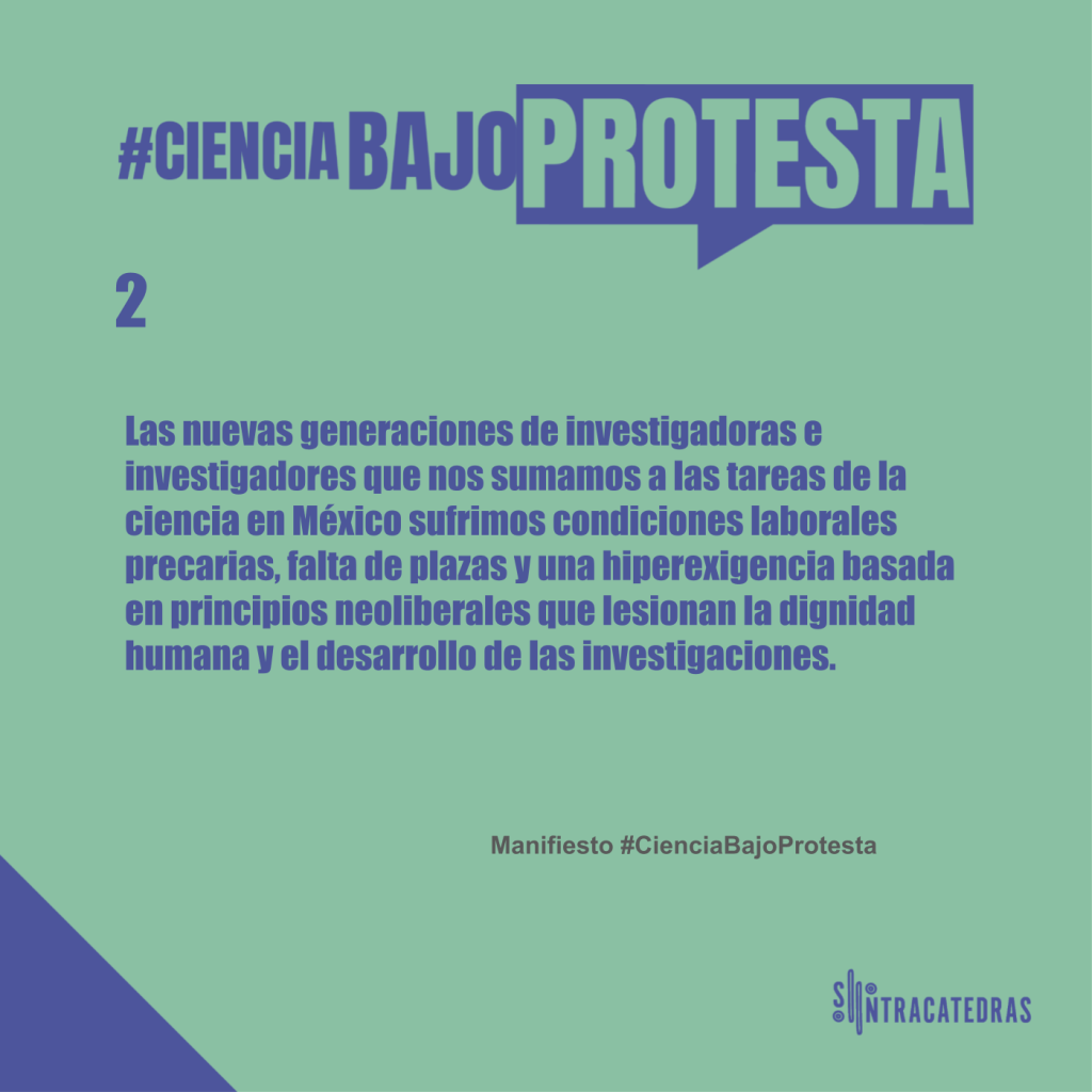 Tras una protesta nacional de trabajadores y trabajadoras del Programa Cátedras CONACYT exigiendo respeto a sus derechos y certidumbre laboral al Consejo Nacional de Ciencia y Tecnología realizada el 30 de septiembre, científicos/as dentro y fuera del programa continuamos haciendo #CienciaBajoProtesta. Queremos expresar el rechazo a la precarización del trabajo científico y la falta de oportunidades para egresados y egresadas de posgrado en nuestro país.