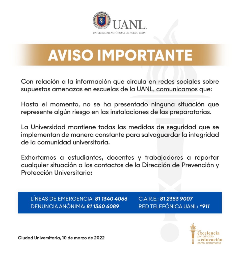 En el comunicado de diez líneas, las personas encargadas del área de comunicación social de la UANL no mencionaron ni una sola vez la palabra mujer. En todo momento se observó una generalización que no sólo invisibilizaba a quienes fueron el blanco de las amenazas, sino un nivel de indiferencia e indolencia tal que asusta más que la incapacidad de ver lo que tienen enfrente. De la Unidad para la Igualdad de Género (UNIIGÉNERO) no se supo ni una sola declaración pública. Esto es material suficiente para confirmar que el estudiantado sabe perfectamente la posición institucional con relación a los temas de género: son contenidos declarativos impuestos por la agenda internacional que dan buena impresión a los organismos evaluadores de programas educativos.