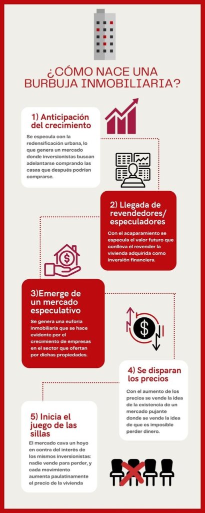 Así es, nos faltaba el tercer actor (además de los dueños del capital financiero y empresas constructoras): el Estado. Todo lo anterior, relacionado con esta desaforada construcción inmobiliaria financiarizada y especulativa, sería menos fácil de realizar sin el respaldo gubernamental. Tal como lo exponen para el caso de Guadalajara en la investigación periodística La ciudad inhabitable: ¿redensificación o destrucción de vivienda? En esa investigación se revisaron 56 desarrollos verticales en Guadalajara y Zapopan encontrando que la mayoría se encuentran deshabitados, “aunque se comercializan a altos precios por su valor como inversión.” Destacan el papel obsecuente de las autoridades para extender permisos y todas las artimañas para pasar por alto irregularidades o imponer míseras sanciones que terminan dejando a la empresa constructora continuar.