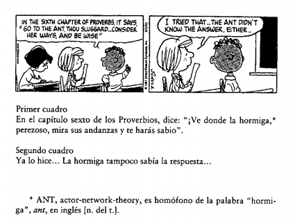 Latour es conocido como uno de los fundadores de la Teoría del Actor Red, una propuesta metodológica y epistemológica que, tomando distancia de los paradigmas vigentes, trata a los objetos como parte de las redes sociales. Él, impulsor de la sociología de las asociaciones[3], toma distancia de la epistemología moderna que separa sujeto y objeto, considerando que los elementos humanos y no-humanos son parte de un sistema que genera ciertos vínculos sociales de donde surge lo social, por lo que los no-humanos son actores, o más precisamente, actantes. Es decir, que para Latour, la acción, o la capacidad de agencia, no es exclusiva de los seres humanos que hacen cosas “con intenciones” y “con significado”, perspectiva que excluye a los objetos y desde donde lo no-humano no tiene posibilidad de cumplir un rol activo por la definición misma de actores y agencias. Y dejando así fuera de los análisis interacciones concretas que son en sí no sociales.